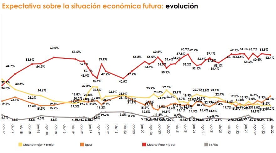 La mirada hacia el futuro se presenta de otra manera. Aproximadamente el 38% dice que la economía estará mucho peor y un 24% algo peor. En conjunto, quienes tienen esta percepción fueron un 1% menos que en octubre.