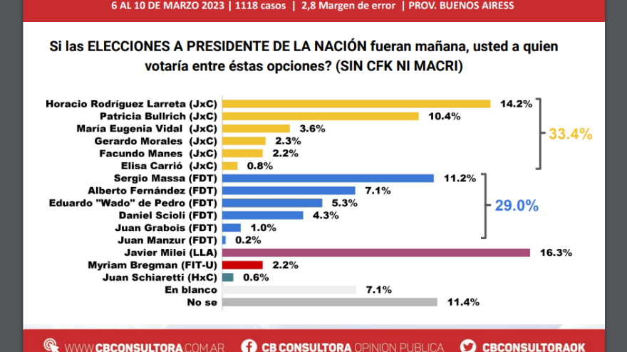 En ese escenario Rodríguez Larreta lideró dentro de la alianza opositora con el 14,2%, por encima de Bullrich (10,4%) y Vidal (3,6%) y del lado del Frente de Todos el que encabezó fue Massa con el 11,2% que también lo ubicó por arriba del Presidente (7,1%), de "Wado" de Pedro (5,3%) y de Scioli (4,3%).