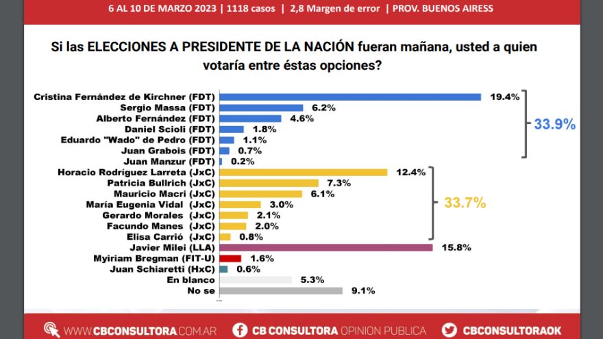 La vicepresidenta lideró la intención de voto a nivel general y también dentro de su espacio con el 19,4%, mientras que Rodríguez Larreta encabezó la interna de Juntos por el Cambio con el 12,4%. Entre ambos, el único "cabo suelto" es el libertario Javier Milei, que sin competidores en las PASO midió un importante 15,8%.