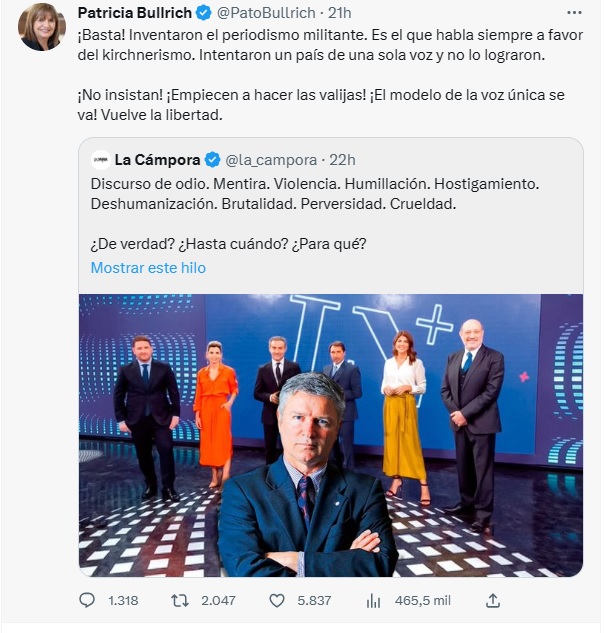 La aspirante presidencial respondió así a una publicación que realizó La Cámpora en su cuenta oficial de Twitter, donde cuestionó el rol de los medios de comunicación: "Discurso de odio. Mentira. Violencia. Humillación. Hostigamiento. Deshumanización. Brutalidad. Perversidad. Crueldad. ¿De verdad? ¿Hasta cuándo? ¿Para qué?".