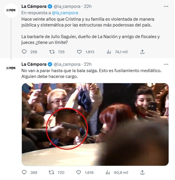 Además, la agrupación política hizo referencia al intento de asesinato de la vicepresidenta el pasado 1 de septiembre: "No van a parar hasta que la bala salga. Esto es fusilamiento mediático. Alguien debe hacerse cargo".