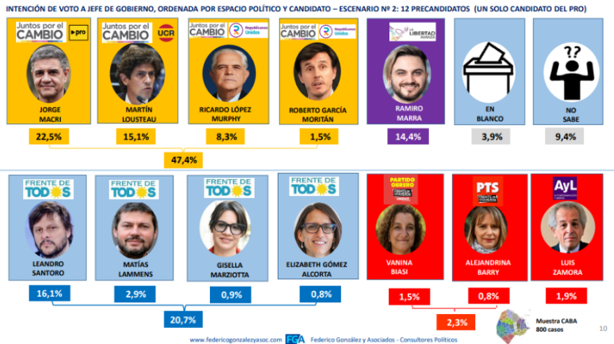 En cambio, si fuera Lousteau cosecharía un apoyo apenas menor, con el 40,4%, pero en este escenario Santoro se mantuvo casi igual con 21,1% y Marra subió apenas al 17,9%.