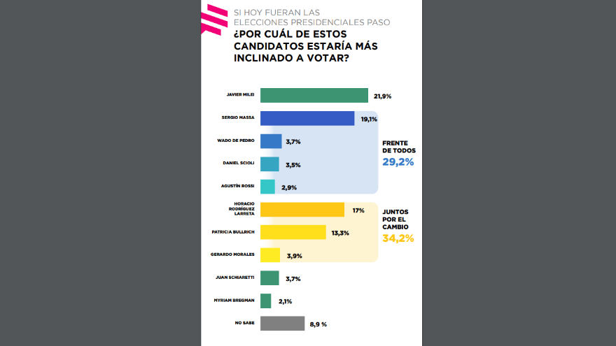 En los tres escenarios se repiten dos factores: Juntos por el Cambio supera al Frente de Todos con la sumatoria de sus precandidatos (33,5% a 27,4%; 34,2% a 29,2% y 31,4% a 28,3%, respectivamente) y el libertario Javier Milei, que no tiene competidores internos, aparece como el de mayor intención de voto individual en el orden del 22%.