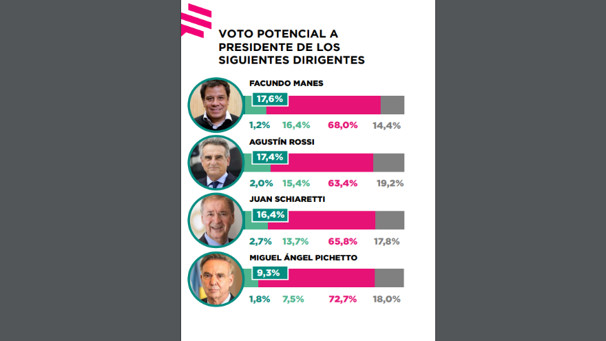 Se trata de Pichetto y Manes, por Juntos por el Cambio, Rossi por el Frente de Todos y el gobernador saliente de Córdoba, Juan Schiaretti, que busca fortalecer un espacio político "anti grieta". Los cuatro mostraron el potencial de voto más bajo entre las principales figuras nacionales.