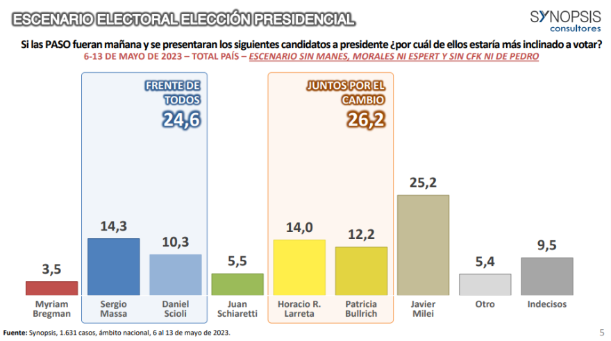 Así se desprende de la última encuesta de la consultora Synopsis, que arroja dos datos clave: que Milei afianza su "tercio" de cara a las PASO con buenas perspectivas de ser el candidato individualmente más votado pero se debilita para las generales y que Larreta corre con una leve luz de ventaja frente a Bullrich, potenciada por la proyección de un balotaje.