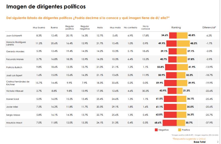 En esa nómina, lo secundó la también aspirante presidencial del PRO Patricia Bullrich (41,9% de imagen positiva y un diferencial de -13,9%) y en tercer lugar se ubicó el gobernador de Córdoba, el peronista Juan Schiaretti, con el 40,8% de imagen positiva y un diferencial de 6,2%). En tanto, el ex presidente Mauricio Macri se posicionó como el dirigente con mayor imagen negativa (68,6%), junto al ministro de Economía, Sergio Massa (62% de imagen negativa); al embajador argentino en Brasil y precandidato a presidente del Frente de Todos (FdT), Daniel Scioli (61,5% imagen negativa), y al aspirante presidencial por La Libertad Avanza y diputado nacional, Javier Milei (61,1%).