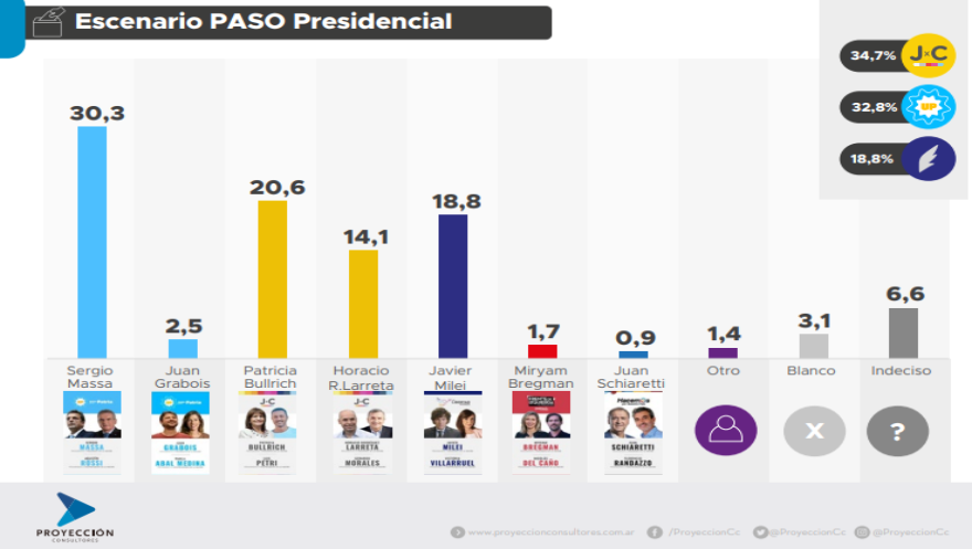 Según la encuesta de Proyección, Massa cosecha una intención de voto del 30,3% de cara a la PASO con Grabois, que tiene un magro 2,5%. Es un fuerte contraste con la medición previa que incluyó a Eduardo "Wado" de Pedro, Daniel Scioli y Agustín Rossi, hoy compañero de fórmula del ministro de Economía, como precandidatos presidenciales.