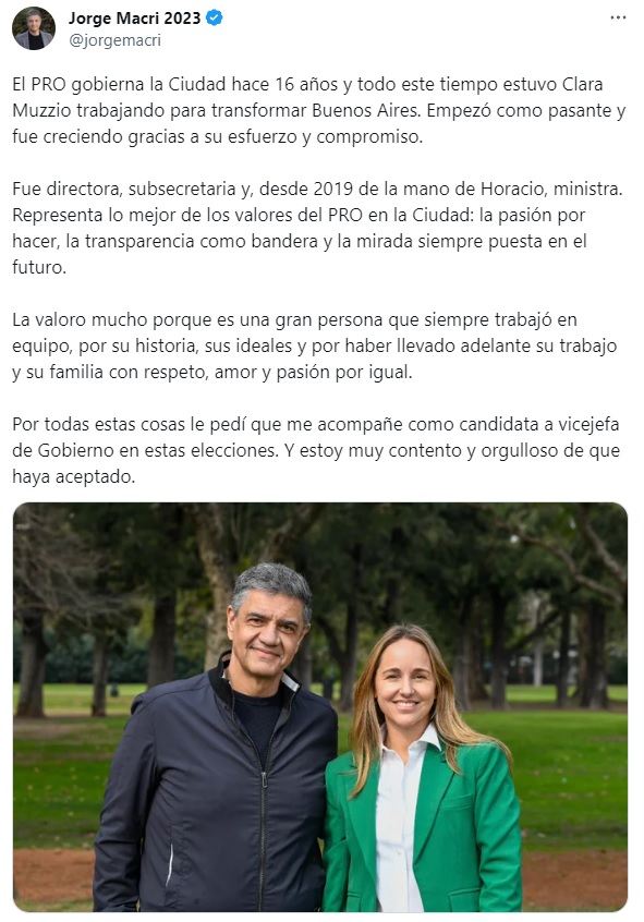Macri hizo el anuncio a través de Twitter y dijo que Muzzio "representa lo mejor de los valores del PRO en la Ciudad: la pasión por hacer, la transparencia como bandera y la mirada siempre puesta en el futuro".
