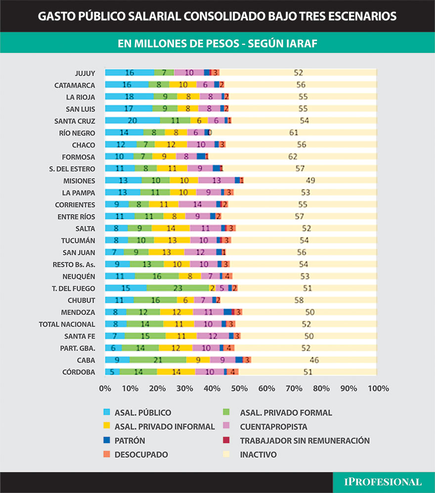 Según un estudio de la Fundación Mediterránea, el 45,5% de la economía argentina se encuentra no registrada. En Chaco, por ejemplo, ese porcentaje sube al 63,8%; en Salta, a 61,1%, y en Jujuy, 60,4%. El trabajo del IERAL refleja que en 13 de las 23 provincias argentinas el empleo público supera al empleo privado formal.