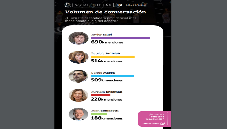 El estudio arrojó que Milei fue el más mencionado en las redes sociales durante el día del debate con 690 mil. Debajo suyo se ubicó Bullrich con 514 mil menciones y el oficialista Sergio Massa quedó un poco más atrás con 509 mil.