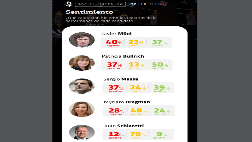 En tanto, a pesar de haber sido el más mencionado Milei tuvo apenas un 37% de valoración positiva, con 40% de negativa y 23% neutral. Sobre Bregman las menciones fueron 24% positivas, 28% negativas y el 48% fueron neutrales, mientras que sobre Schiaretti apenas el 9% fueron positivas, el 12% negativas y el 79% neutrales.