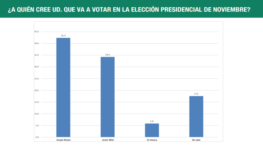 La encuesta de Analogías arrojó una intención de voto para Massa de 42,4% mientras que Milei cosecha el 34,3%. Entre los consultados, el 5,8% respondió que votará en blanco y un altísimo 17,5% respondió que "no sabe" a quién elegirá en la segunda vuelta electoral.