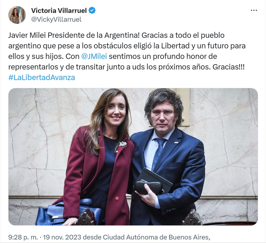 "Javier Milei Presidente de la Argentina! Gracias a todo el pueblo argentino que pese a los obstáculos eligió la Libertad y un futuro para ellos y sus hijos. Con @JMilei sentimos un profundo honor de representarlos y de transitar junto a ustedes los próximos años. Gracias!!! #LaLibertadAvanza", escribió en las redes sociales Villarruel tras conocerse el triunfo.
