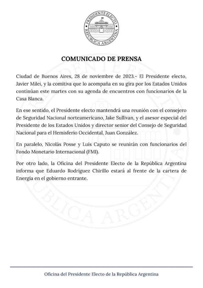 El nombramiento se hizo oficial con la publicación del comunicado en la cuenta de X de la Oficina del Presidente Electo de Argentina (@OPEArg).