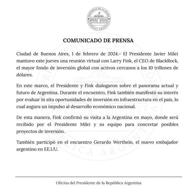 "Para quien no lo sabe, es el presidente y consejero de BlackRock, un fondo de inversiones que tiene acciones en innumerables en empresas como Microsoft, Amazon, Apple, Coca Cola, Twitter Pepsico, y viene a ratificar un camino de inversiones con una perspectiva de 50 años en adelante", agregó.