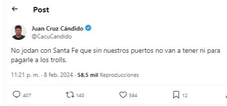 El funcionario de Maximiliano Pullaro escribió en su cuenta de X: "No jodan con Santa Fe que sin nuestros puertos no van a tener ni para pagarles a los trolls".