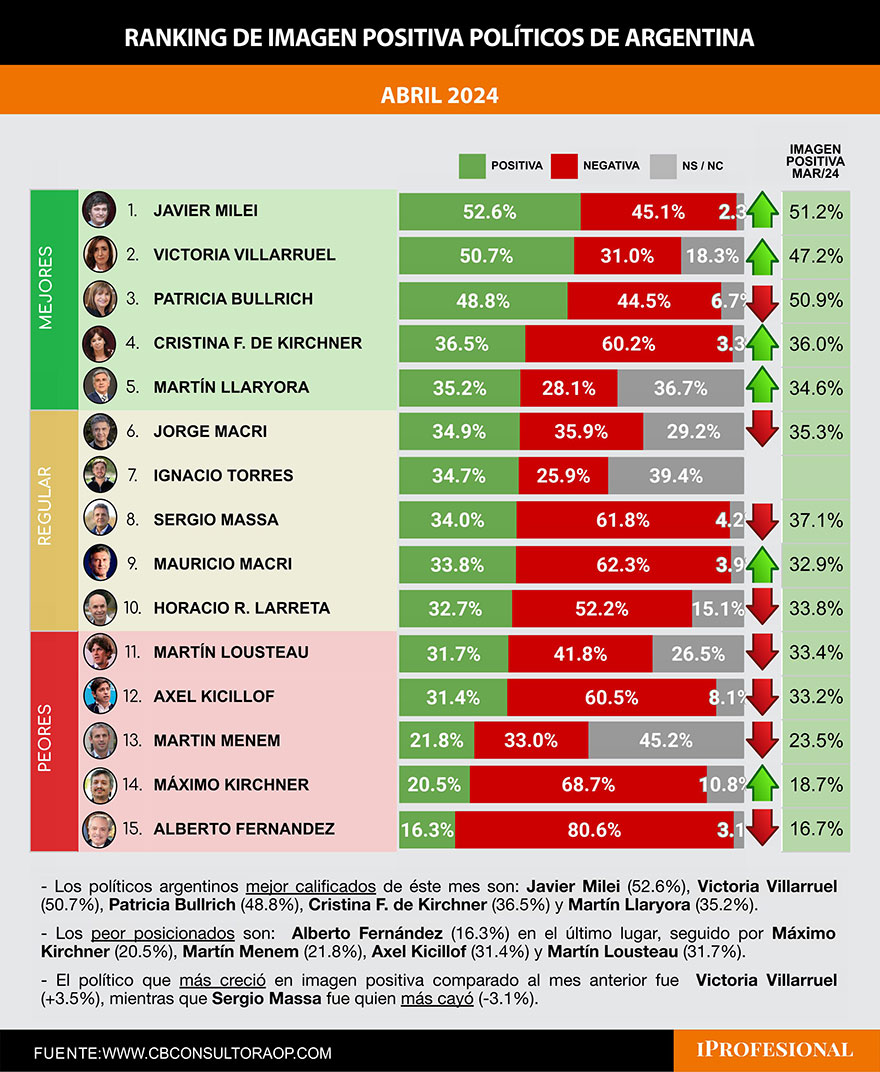 En Abril de 2024, los políticos argentinos mejor calificados de ese mes fueron: Javier Milei (52.6%), Victoria Villarruel (50.7%), Patricia Bullrich (48.8%), Cristina F. de Kirchner (36.5%) y Martín Llaryora (35.2%).