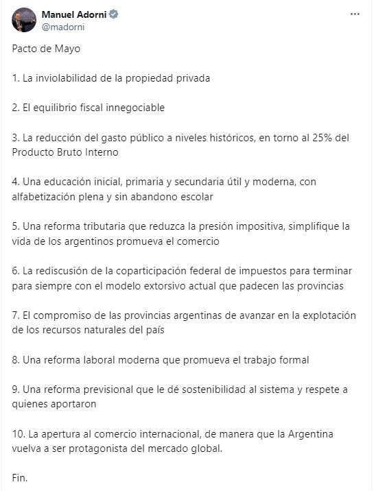 En concreto, Adorni señaló que los 10 puntos del Pacto de Mayo serán los siguientes: