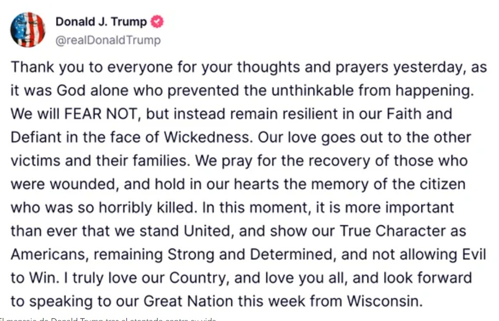 "Gracias a todos por sus pensamientos y oraciones de ayer, ya que fue solo Dios quien impidió que ocurriera lo impensable. No tendremos miedo, sino que en lugar de eso, nos mantendremos resilientes en nuestra Fe y desafiantes ante la maldad", señaló el exmandatario en su mensaje.