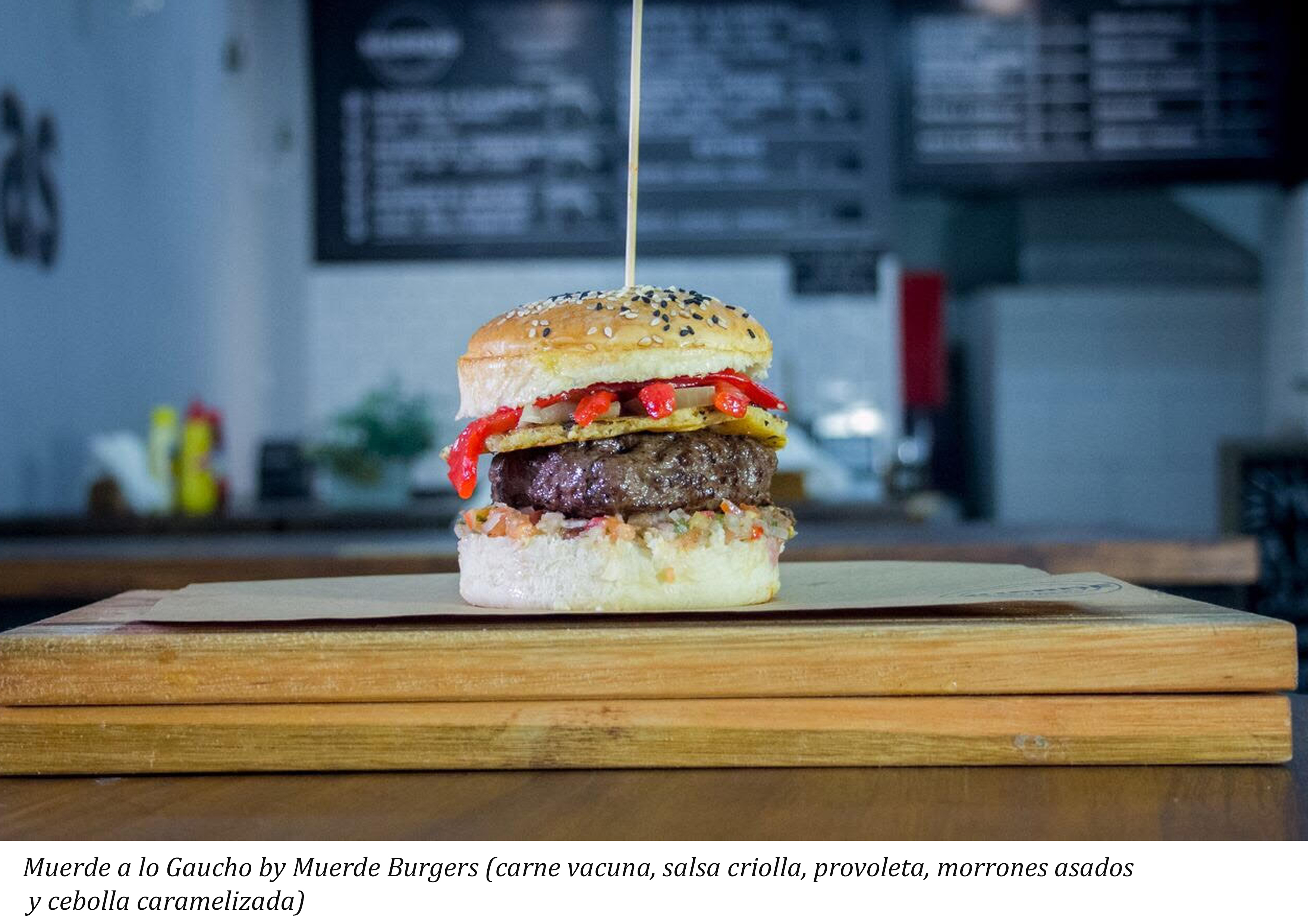 Descripción: 170grs de carne, salsa criolla, provoleta, morrones asados y cebolla caramelizada.