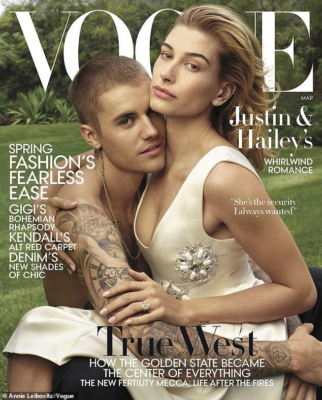 En la tapa de Vogue, fotografiada por la reconocida Annie Leibovitz, la pareja aparece abrazada sobre el pasto. Mientras que Justin está sin camisa, Hailey lleva lo que parecería un vestido de novia con detalles de pedrería.