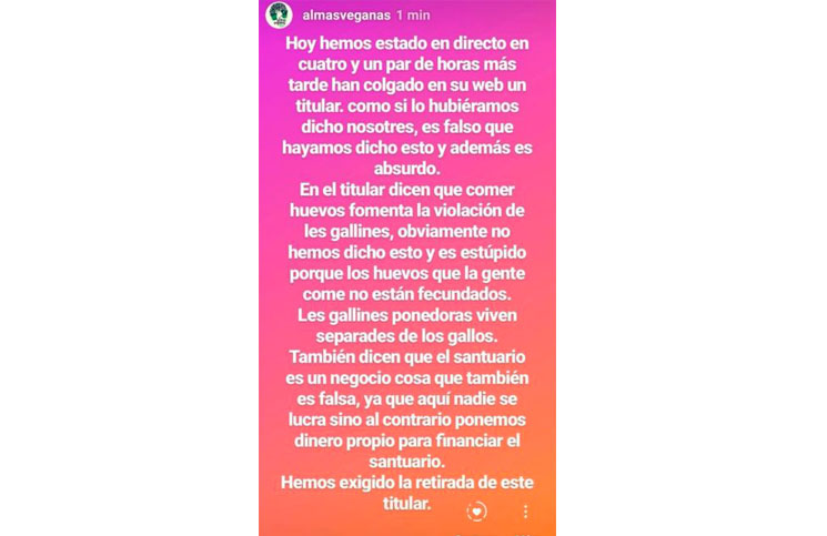 "Hoy hemos estado en directo en cuatro y un par de horas más tarde han colgado en su web un titular, como si lo hubiéramos dicho nosotres, es falso que hayamos dicho esto y además es absurdo.