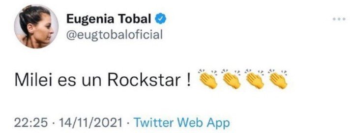 Entonces, ella decidió borrar el tuit en el que comparó al líder del emergente movimiento libertario con una estrella de rock, y publicó otro que fijó en su "timeline" y decía: "No me interesa ni hablar ni pelear por política. No lo hice nunca ni lo haré. Lamento que, atreverse a divertirse con algunos comentarios haga que se se vuelva todo tan agresivo".