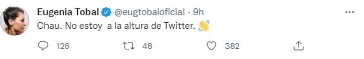 Y, acto seguido, la también ex mujer de Nicolás Cabré (41) sumó a modo de despedida: "Chau. No estoy a la altura de Twitter". En ese momento, muchos de sus fans salieron a apoyarla.