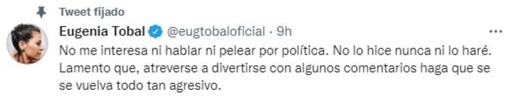 Eugenia Tobal (45) escribió este domingo un inesperado tuit sobre Javier Milei (51) que le valió decenas de críticas. Y aunque lo borró, los agravios siguieron, por lo que la actriz decidió responderle a quienes la atacaron y aseguró: "No me interesa ni hablar ni pelear por política".