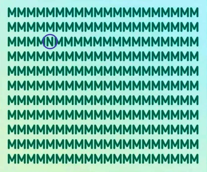 Las instrucciones son muy fáciles. En la imagen de abajo se repite la letra M numerosas veces. Sin embargo, entre tanta letra se esconde otra muy parecida, la letra N.