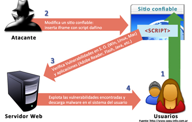 2. El sitio web es atacado y modificado por los delincuentes de forma tal que junto a la página requerida por el usuario, también se carga otro sitio web dañino-script e iframe- de forma transparente.