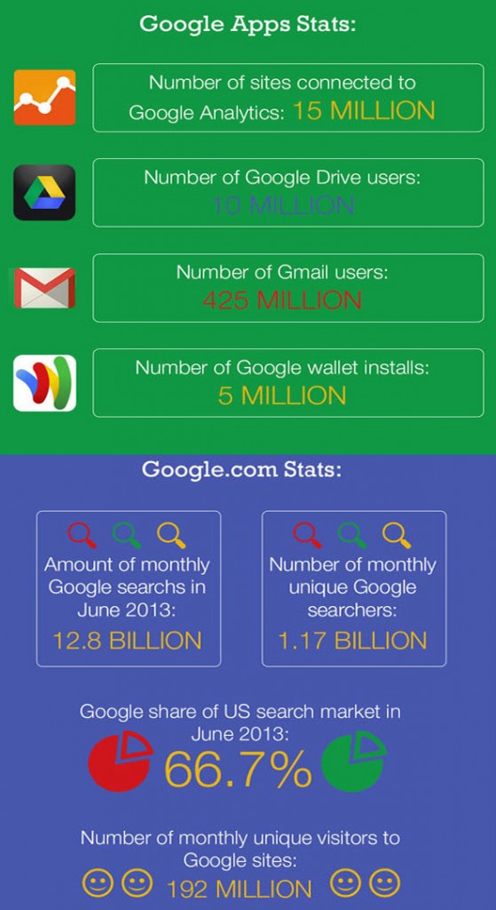 Las cifras hablan por sí solas: más de 425 millones de cuentas de gmail, 10 millones de usuarios de Google Drive, 15 millones de sites analizados por Google Analytics, 1.17 billones de usuarios únicos mensuales, según consignó el sitio Empleo y Emprendedores. Estos números récord difílmente serán alcanzados por otra compañía.