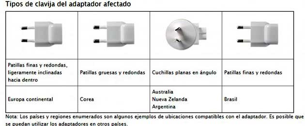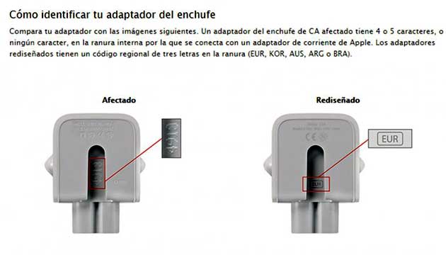 Además de mostrar una imagen, Apple informó que un "adaptador del enchufe de CA afectado tiene 4 o 5 caracteres, o ningún carácter, en la ranura interna por la que se conecta con un adaptador de corriente de Apple. Los adaptadores rediseñados tienen un código regional de tres letras en la ranura (EUR, KOR, AUS, ARG o BRA)".