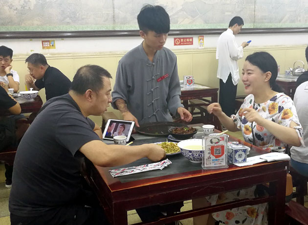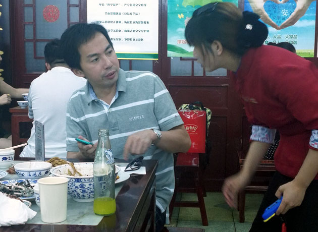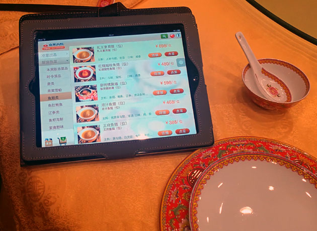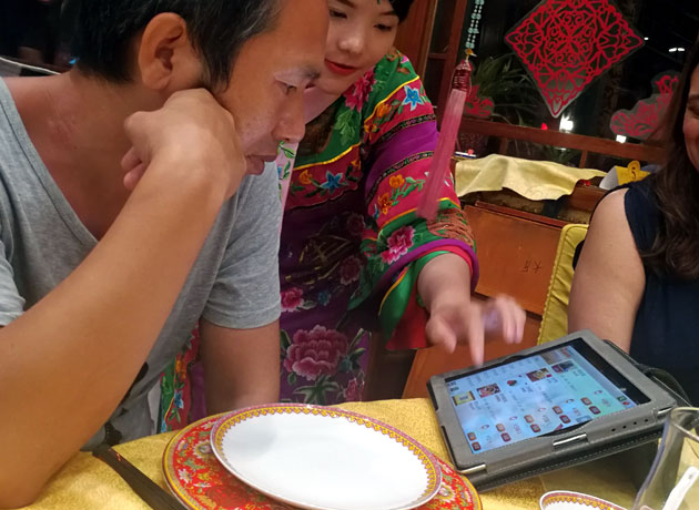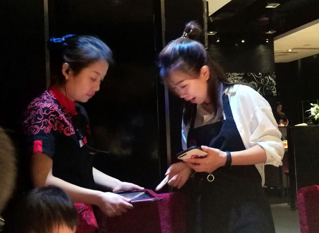 La dinámica habitual en un restaurante es la siguiente: se elige el menú y se le dicta a la moza (la mayoría de los camareros en China son mujeres) las comidas elegidas. La camarera anota el pedido en un teléfono móvil sencillo conectado a la cocina, que recibe la comanda en forma virtual, y a la caja.