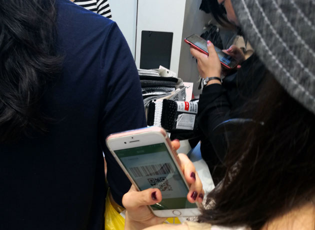 En las tiendas de ropa y otros artículos, es común ver en las cajas carteles que avisan la aceptación de pagos por Alipay, WeChat Pay, Apple Pay y Samsung Pay. Viajes en subterráneo o en Uber o taxis también se pueden pagar por teléfono móvil.