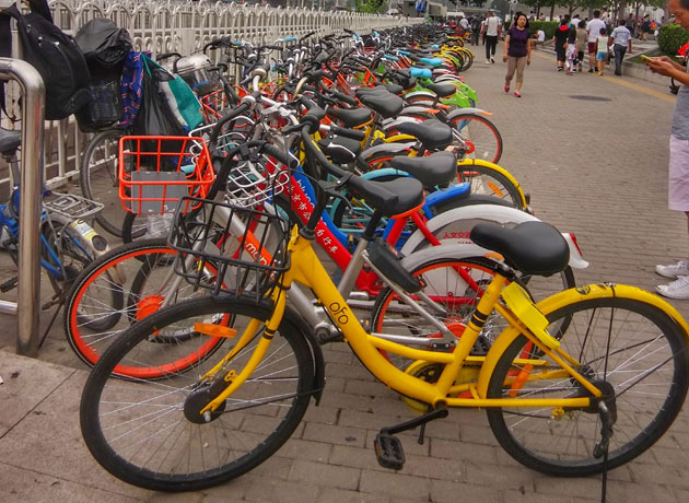 En las veredas de las ciudades hay estacionadas bicicletas de alquiler de diferentes empresas. No están encadenadas.