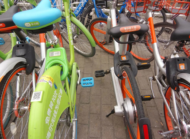 También es habitual ver a trabajadores de oficinas que recogen sus coloridas bicicletas compartidas luego de escanear sus códigos QR.