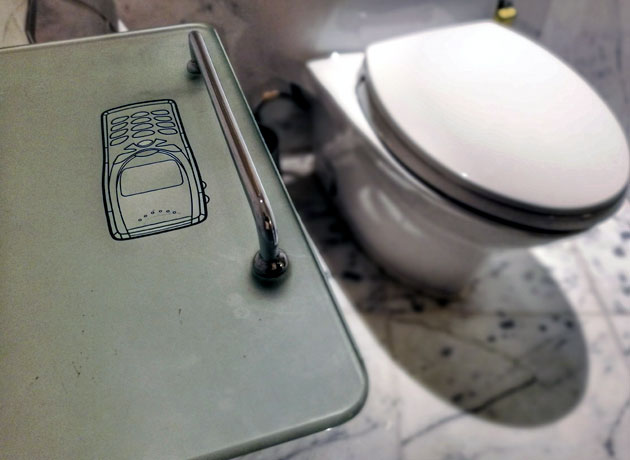 Incluso en los baños hay lugares especiales y señalizados para dejar el celular y que éste no sufra el frecuente percance de su caída al inodoro.