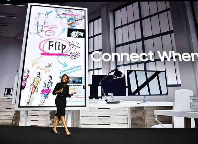 El rotafolio digital interactivo Samsung Flip de 55 pulgadas simplifica la colaboración en la oficina conectándose con los smartphones y las computadoras portátiles de los miembros del grupo para compartir contenido e ideas de un modo más rápido.