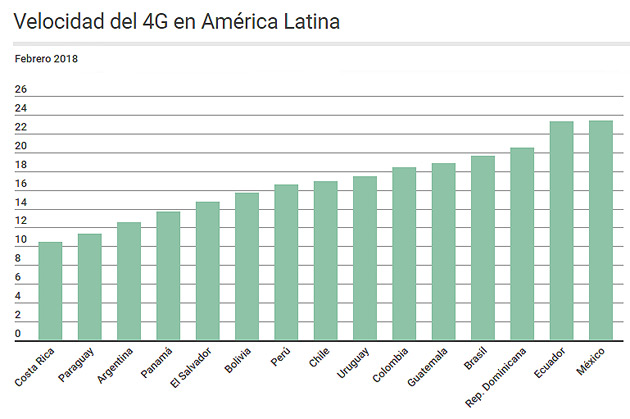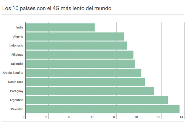 Según datos de Open Signal, Costa Rica es el país de América Latina con el 4G más lento. Tiene una velocidad de descarga promedio de 10,5 Mbps, muy por debajo de la media mundial que es de 16,9 Mbps. En segundo lugar está Paraguay (11,31 Mbps) y el en tercer puesto, Argentina (12,53 Mbps). Estos tres países también figuran entre las diez naciones con peor velocidad LTE a nivel global, indica Infobae.