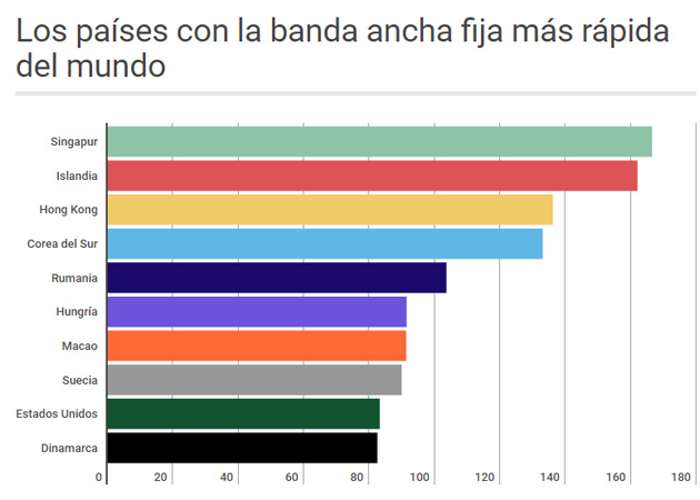El país con mejor nivel de conexión en el mundo es Singapur (166,4 Mbps), seguido por Islandia (161,98), Hong Kong (136,15 Mbps) y Corea del Sur (133,05 Mbps). Estados Unidos (83,20 Mbps), por su parte, está en el puesto número nueve.