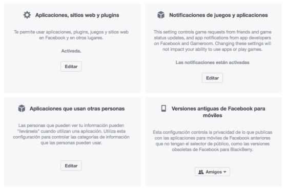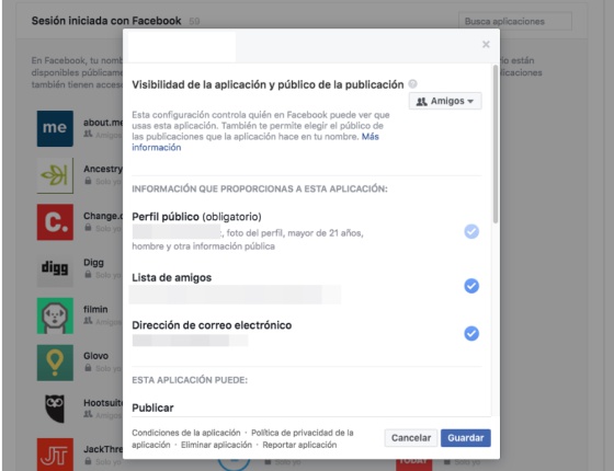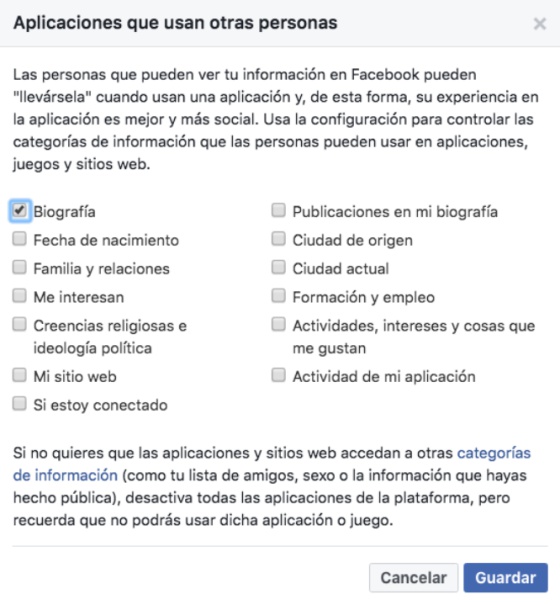 Seleccione editar y aparecerá un formulario con una docena de casillas relativas a datos personales que aplicaciones externas pueden acceder si un contacto les cede esos datos a un juego o una aplicación. Desactive todas y cada una de las casillas que considere adecuadas, la recomendación es que sean todas.