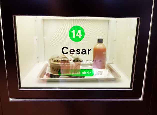 El pedido se retira, ya sea para llevar o para consumir dentro del local, por uno de los 18 boxes automatizados en los que aparece el nombre del cliente, quien puede tocvar la pantalla táctil pára retirar la comida. Todo el proceso no lleva más de tres minutos y medio y nunca se interactúa con una persona.