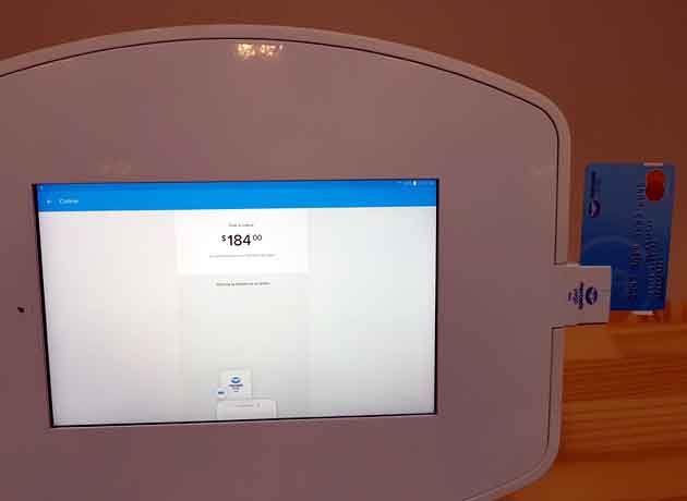 Antes de terminar el proceso en la tableta, se abona con tarjeta de crédito o tarjeta de Mercado Pago, vinculada a los fondos que el consumidor tenga en esa plataforma, propiedad de Mercado Libre. La tarjeta se pasa por un lector ubicado al costado de la tableta.