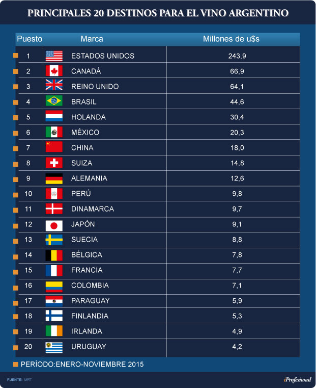 primer puesto.Las bodegas nacionales realizaron envíos de vino embotellado hacia ese destino por unos